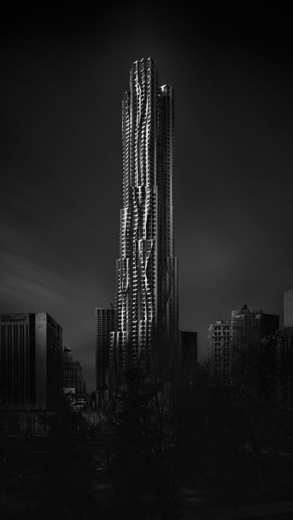 Another example of an architectural long exposure photograph with the camera pointed to the sky in tilted 45 degrees position. This is the NN building in Rotterdam and the exposure time used is very long: 6 minutes and 5 seconds. Clouds were moving with a similar speed as in the previous architectural photograph with a short exposure. The clouds aren’t recognizable anymore as normal clouds but form long streaks of clouds. The same effect of long streaks of clouds can also be achieved with an exposure time of let’s say 3 minutes or shorter. But the clouds will then look a bit shorter with more contrast and ‘thicker’. The photograph that you see here with the very long exposure is an example of the ‘ethereal’ look that I prefer in my architectural photographs, with clouds that are almost transparent. And that’s a look that you are more likely to achieve in long exposure photography when using extended long exposure times of 5 minutes or longer. This photo was part of a series of architectural photographs that received 2nd place at the International Photography Awards 2012