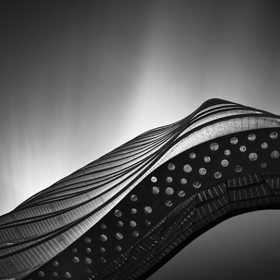 Frozen Music II is part of an award winning series at the 2011 International Photography Awards competition and represents an architectural object with unusual shapes, shot using an extended long exposure time of 3 minutes. This is also a typical example of an architectural long exposure photograph, taking full advantage of the cloud movement with long exposure techniques, where I tilted the camera and pointed it straight upwards to the sky in a perpendicular position to the horizon. Due to this specific angle of the focal plane of the camera and the velocity of the clouds, and of course the prolonged exposure time, this resulted in a dynamic looking, softer streaks of clouds. If the clouds were moving slower and/or the exposure time was much shorter, such as a minute, then the streaks of clouds would look shorter, less transparent and would have more contrast and look sharper and ‘thicker’. Photograph taken just before the sun would set. Technical info: f/16 | ISO 100 | 3 minutes exposure time | 10 stops ND filter.