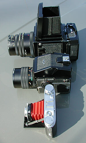 a budget, without loss of quality, consider a folder or two for yourself. Most of the really clean ones have been at the top of grandpa's closet for the last 40 years. Although beautiful, they usually will have two or more of the problems mentioned above. But, these camera can be restored back to pristine condition, and you will have a real medium format camera that is the envy of all your photographer friends, and allows you to surreptitiously photograph fruit and vegetables at will, not to mention sunsets, people, and landscapes. On the right is a comparative image of three of my favorite cameras. On top is the Mamiya RB67 ProSD, in middle is the Mamiya M645 1000S, and on bottom is the Agfa Isolette III. All three use the same 120 film. Which do you think I carry with me daily? (Clue: It has a red bellows) When I fold up my little Isolette, I have a medium format camera that I can put in my pocket. It shoots 12 - 6x6cm (2 1/4" x 2 1/4") images, the same as a Hasselblad. In my humble opinion, it even rivals the Hassy in image quality! Cost: Less than $250.00 fully restored. (Chuckle, chuckle!) |