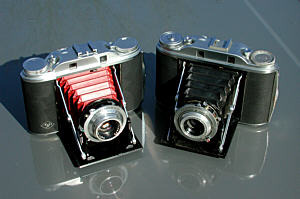 spouses! The picture at left shows the author's two 6x6cm Agfa Isolette III folder cameras. One is opened and the other closed. Look!...Medium Format in Your Pocket! |