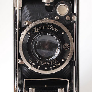 My example ot the Cocarette dates from after the formation of Zeiss Ikon, and is badged as such around the lens, on the folding bed, and imprinted on the leather at the top of the body; the name Cocarette likewise appears in three places, while the model number does not, but possibly this may have been on the handle, missing on my camera (it does, however, still have the folding stand on the drop bed's front that appears to be missing on most extant examples of the Cocarette). Provided with a reputed 64 combinations of lens and shutter variants, my camera has the top-of-the-range Carl Zeiss Jena Tessar f4.5 120mm lens and Compur rim-set shutter. Both lens and shutter serial numbers can be dated to 1929, being relatively late in the production run. The focal length of the lens is a giveaway for the film type that the Cocarette uses: had the lens been 105mm, this would denote 6x9 on 120 film; that the lens is 120mm indicates that the Cocarette takes a 6.5x11cm frame size on 116 film - although not true for
