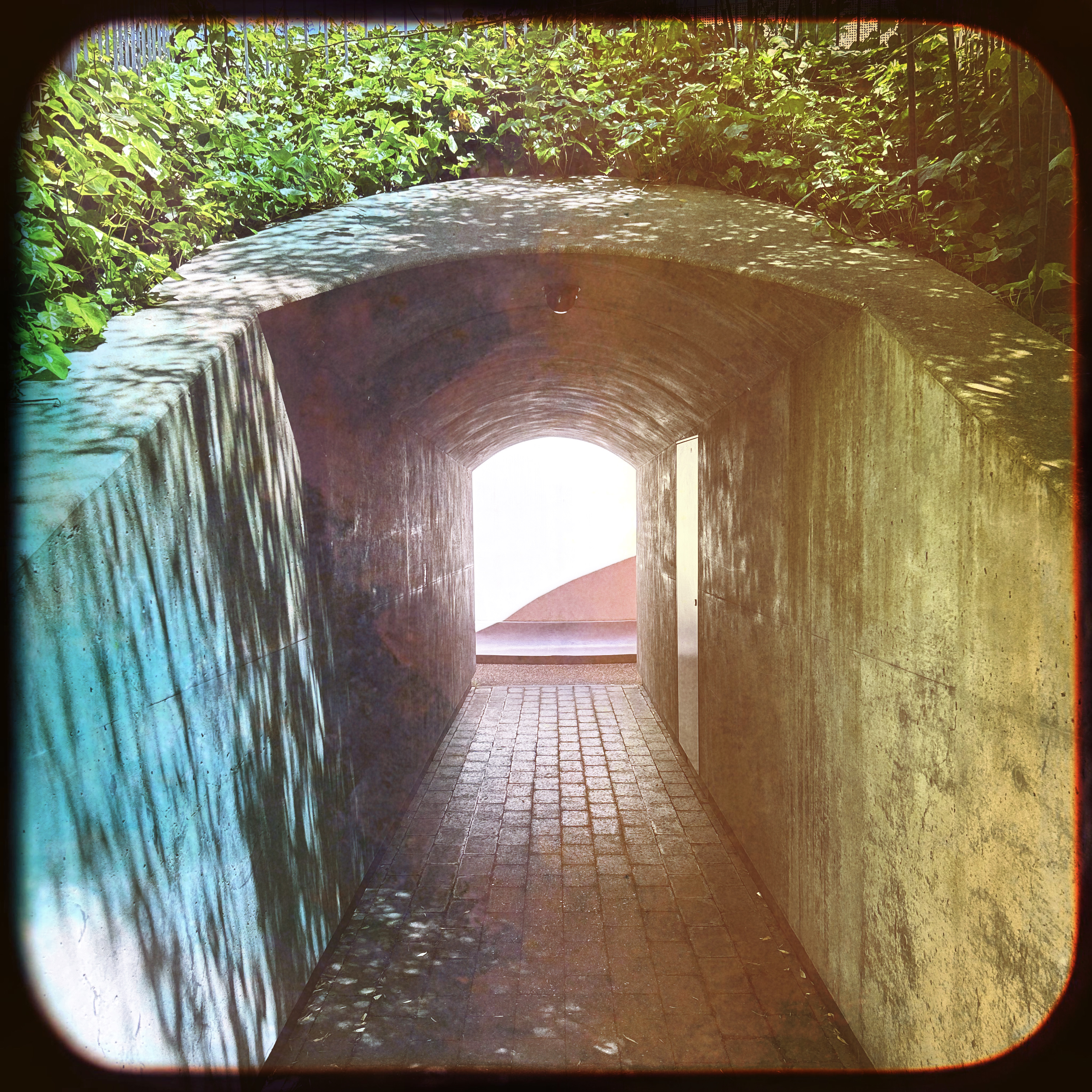 Iris continued walking. The path narrowed and the hedges merged into a concrete tunnel.