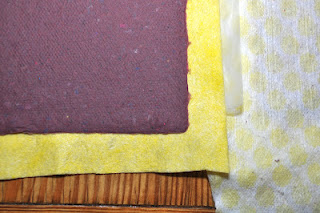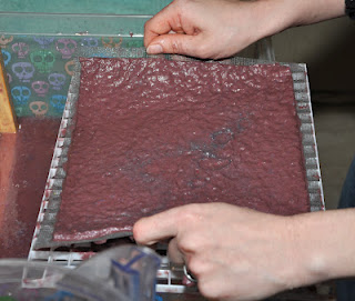 Now place the paper on a different towel, where you will want the papers to dry. The nap of your towel will make a difference on the texture of your paper. You can use felt, if you would like super smooth paper, or Dick Blick sells paper called couching paper specifically for this purpose. Sponge the back over the screen a few times, and then slowly lift the screen off. If the paper rips you can return the pulp to the tub and stir it back in!