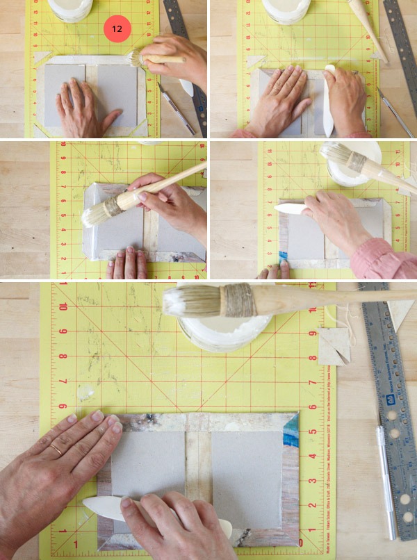 Step 12: Next lightly brush glue onto the top flap and tightly fold it over. Use the bone folder to ensure the canvas is glued tight, especially go over the spine where the canvas is glued to itself. Repeat this on the other three sides.