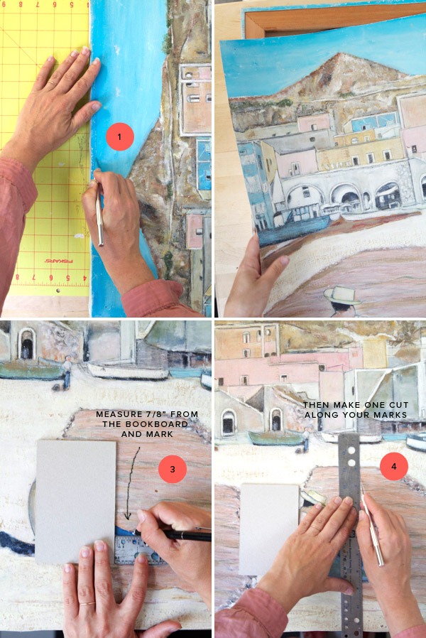 Materials Needed: Painting on canvas (I get mine from thrift stores), Paper Source book kit (I used this one), pencil, bone folder, exacto knife, a large brush, archival glue