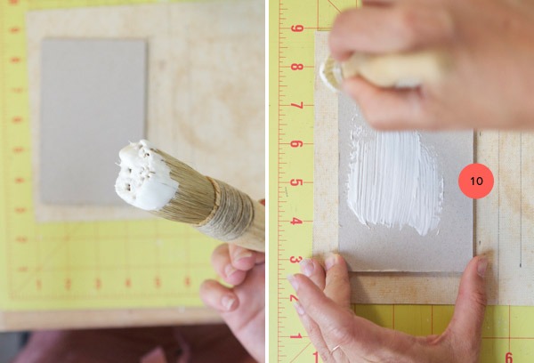 Step 10: Take your brush and lightly brush glue onto the book board. Turn it over and place it along the glue marks. Make sure the book board is straight and lined up to the marks. Repeat this with the second book board on the other side.