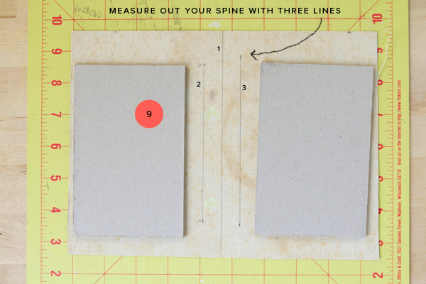 Step 9: Lay the book cover painting side down. Make three lines for the spine, they will be your glueing marks. Line 1 is in the exact center of the canvas. Lines 2 and 3 mark the edges of the spine where you will glue the book boards.