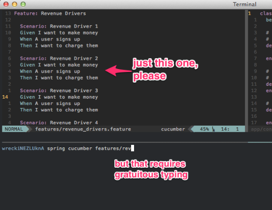 I flush out the functionality and hit <leader>l to run the last command again. Regardless of the vim split I'm in, the last set of specs runs again.