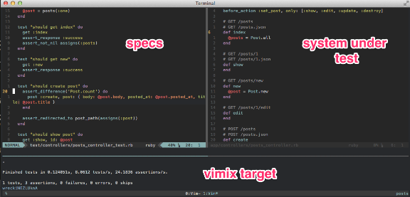 You can find my Turbux config, Vimux config, and Filetype specific mappings in my dotfiles. With each of these little tools talking harmoniously, I feel in total control of my development time. I'm no longer scrolling guard output buffers or touching files just to run certain specs.