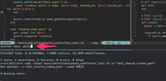 After writing my new test, I hit <leader>s to run the spec under the cursor. No more questions about which Tmux window and pane to run tests—Vimux has my back.