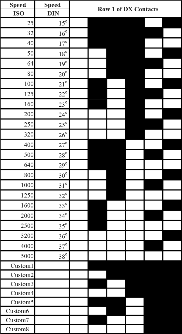 The top row identifies the film ISO speed. Depending on the combination of these contacts, the top row represents speeds from ISO 25 through to ISO 5000. There are also eight custom combinations available.