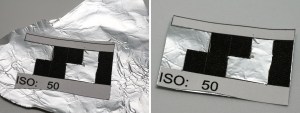 After the contact areas have been cut out, the blank spots require something metallic for the sensors to connect with. Tin foil works well for this, I tend to use the less reflective side which is very similar to the contacts on the original film cartridge. After affixing the label to the foil, cut around the foil to make it the same size as the label.