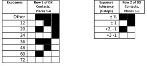 The second row is split into two parts. The first four contact areas identify the number of exposures the cartridge contains in regular 135 format, from 12 exposures through to 72. There is also an option for “other”. The final two contact areas allow for identification of the film tolerance, with the options being half an f-stop over/under, 1 f-stop over/under, 2 f-stops over and 1 f-stop under and finally 3 f-stops over and 1 f-stop under.