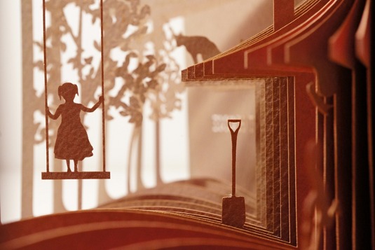 Japanese artist and designer Yusuke Oono creates books that open up to tell their stories as a multi-layered 3D scene. Each page is a separate laser cut plane, and together they make up deep and gorgeous 3D images that reveal the story as you make your way from the front to the back of the book.