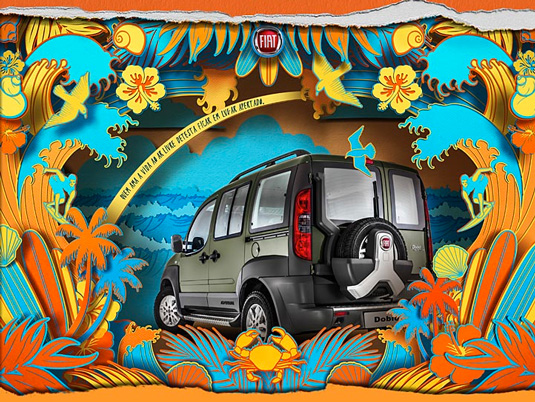 Brazil-based illustration agency D'Avila Studio created this vibrant paper art piece as part of Fiat Motors campaign to promote its new SUV, the Dobló Adventure. The team created two prints, both of which placed the paper overlapping on layers to create an impressive depth effect.