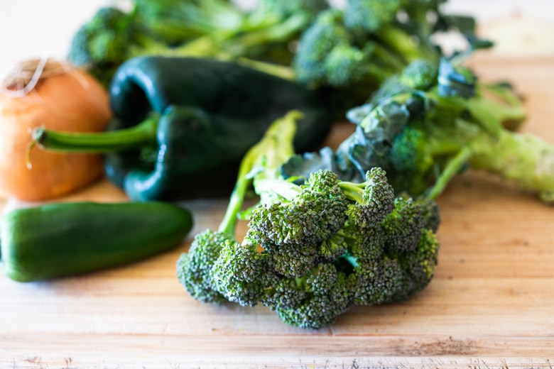 The soup starts with sauteing the onion, garlic and peppers. I used two poblanos and 1 jalapeno. The soup was mildly spicy. Barely spicy truthfully. There is a lot of broccoli to counteract the peppers.