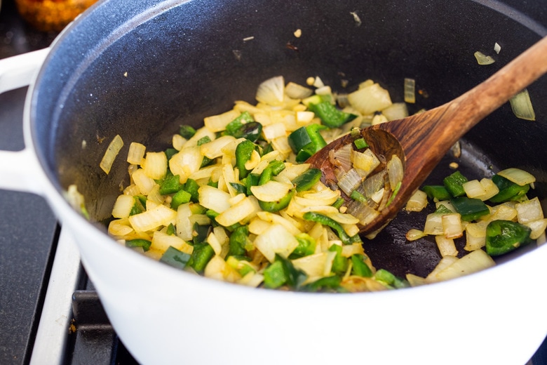 - Heat oil in a big pot over medium heat, and add the onion, garlic, poblanos and jalapeno, stirring occasionally, letting the onions get golden, about 5 minutes.
