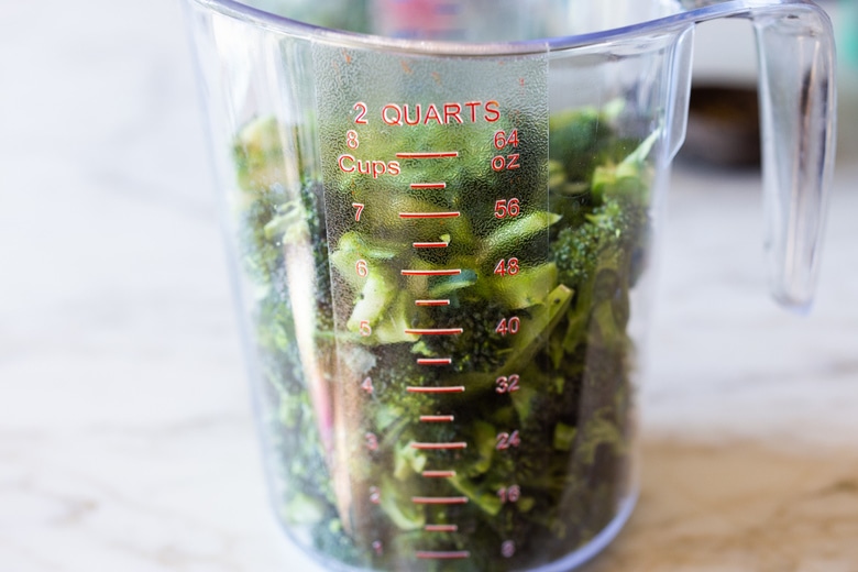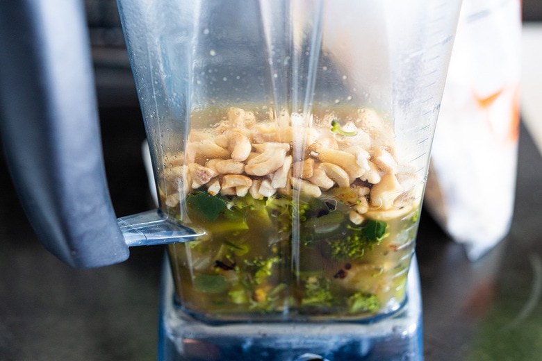So I usually start with just one cup broccoli and 1 cup broth with the cashews, blend until smooth, then add the second cup of broccoli and broth.