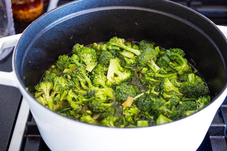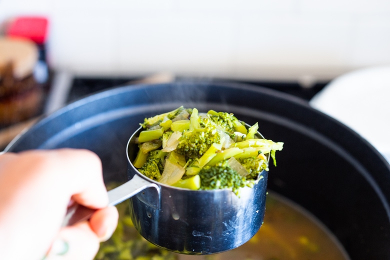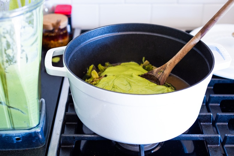 - Pour this back in the broccoli soup pot, mix and heat gently over low heat, careful not to boil or simmer too long, or you will lose the lovely vibrant green color.