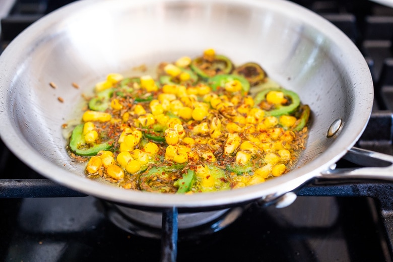 To finish the soup, add the flavorful tempering oil. Quickly saute sliced jalapeno in olive oil with whole cumin seeds and Aleppo. Throw in some corn if you have some in your freezer, and just spoon this over the soup. So tasty!