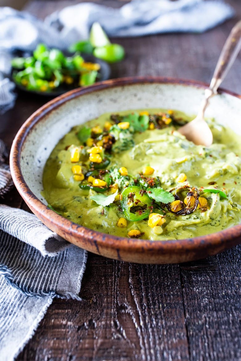 It’s not spicy, just super flavorful! Cashews (or hemp seeds) give the soup its rich creaminess. Nutritional yeast gives it its cheesy flavor. Or feel free to use vegan Daiya Cheddar Shreds that actually melt.