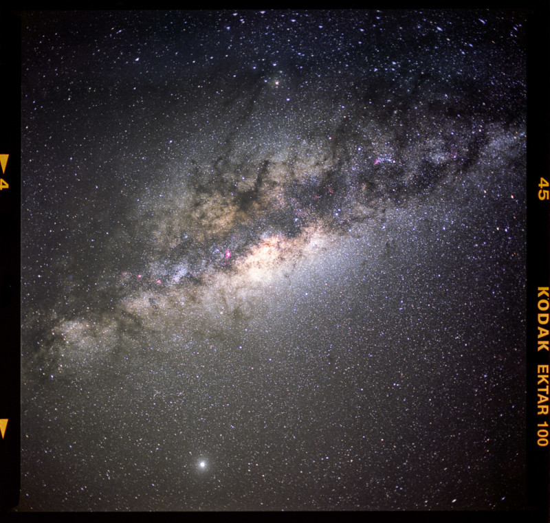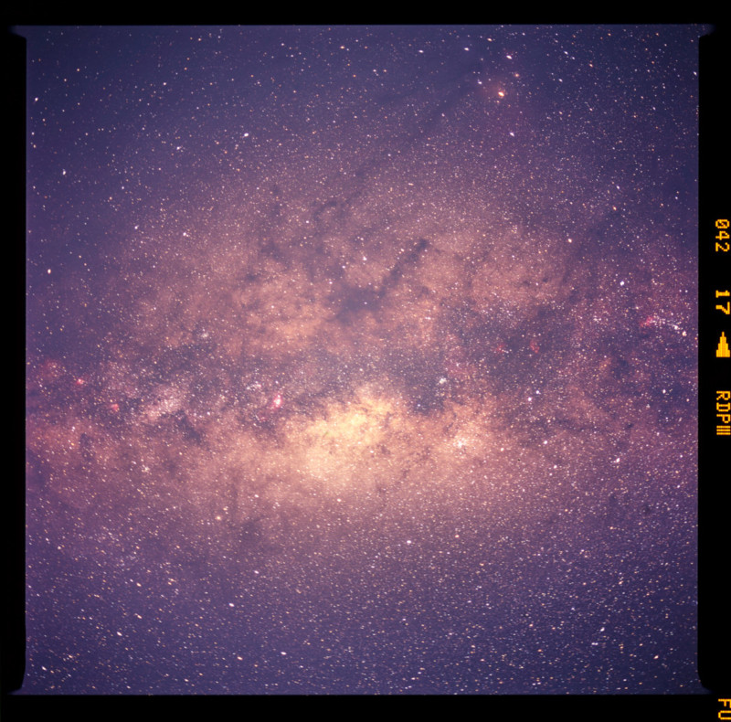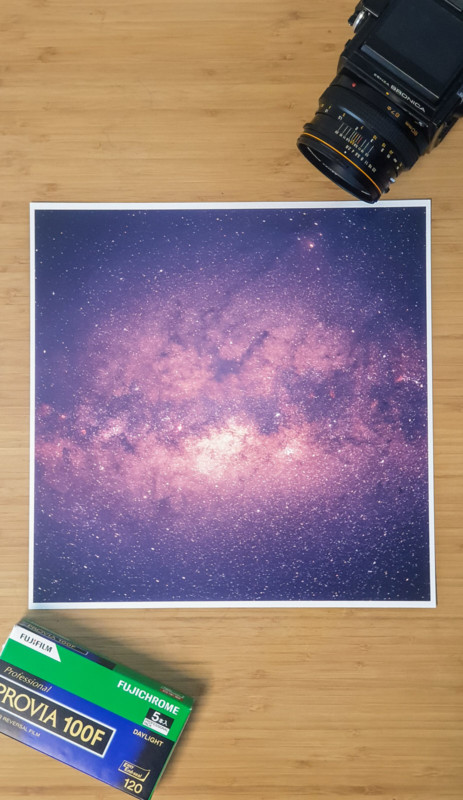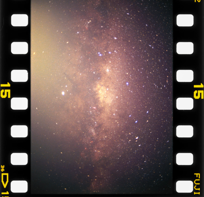 Shooting the Milky Way on 35mm is a good place to start because you have much faster lenses available — at an aperture of f/1.4, you’re getting an exposure duration of around 15 minutes on Provia 100 (with some pushing).