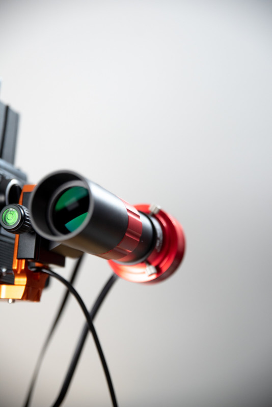 When shooting on medium format cameras, the fastest lenses are typically f/2.8 or f/3.5, so you’ll be tracking exposures of greater than an hour. This is beyond the normal scope of a tracker like the Star Adventurer but there’s a way to increase its performance even more. It’s a feature called guiding, which is yet another camera with a scope (this time aligned with your imaging camera). It looks at the stars near your imaging target and monitors the error in your tracking, it then sends pulses to the tracker to correct these errors. I use a ZWO 30mm/f4 guide scope with an ASI120MC-S camera and PHD2 guiding software.