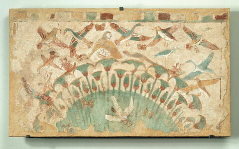 Décor : chasse aux oiseaux ; fourré de papyrus ; papillon ; oiseau ; canard ; chouette ; huppe ; héron (?) ; nid d'oiseau ; genette ; ichneumon