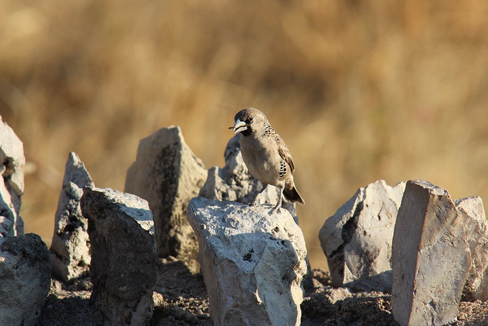 Calling the semi-arid plains of Namibia and South Africa its home, social weavers make use of several different materials, building the nest by weaving in twig after twig. Then they line the insides of the chambers with luxurious grass and feathers and, occasionally, cotton balls that Leighton accidentally drops in the field (perhaps it’s their keen sense of symbolic justice—he uses the cotton after drawing blood from the birds for genetic sampling).