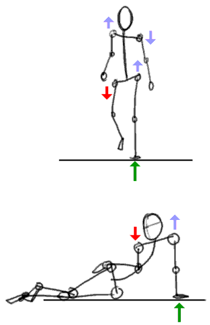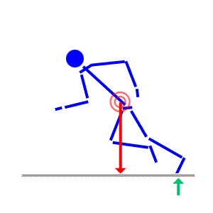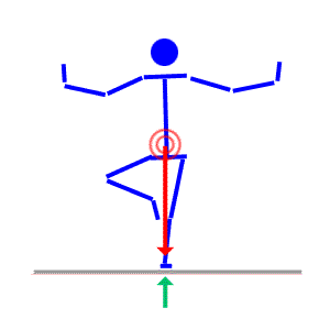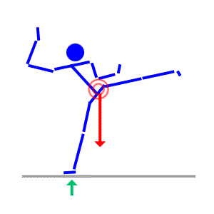 Here the body leans to the right, causing inbalance. You will notice that the center of gravity shifts a bit to the right as well. |