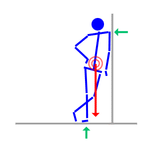 Here the center of gravity lies next to the resting point. This is inbalance, causing the body to move sideways to the left.