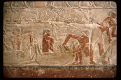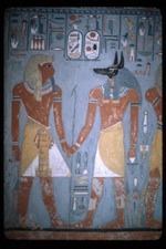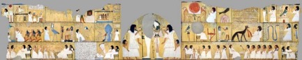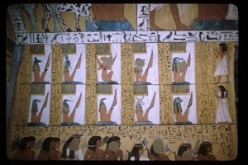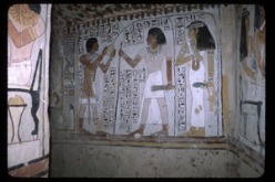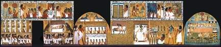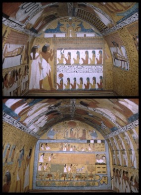 Because the king was revered as God, his tomb (the pyramid) was constructed to last forever, thus ensuring the continuing prosperity of the king in his afterlife. Like the early mastabas, the 4th dynasty pyramids had no decorations. The 5th dynasty (Old Kingdom) which saw the construction of more modest pyramids contained the first decorations. These decorations (Fig. 3 and 4) took the form of hieroglyphic writings - known as the Pyramid Texts - which provide guidelines and instructions on how to ensure safe voyage through the nether world and the eternal life thereafter. The construction of the pyramids disappeared during the first intermediate period and attempts for revival during the Middle Kingdom were far from successful. A very different approach was taken in the New Kingdom. Very elaborate, deep underground tombs were the norm. Interestingly these were constructed in an area dominated by a huge natural pyramid-shaped formation. Part of the reason for this change was to conceal the tombs from robbers. The New Kingdom saw perhaps the most glorious tombs. These tombs were decorated with scenes of the journey that the king (or queen) would take as they moved from this life to the afterlife and showing the King in the presence of major deities and making offerings to them. The scenes were highly colored and drawn from vignettes from the book of the dead and related subjects (Fig. 5). Each tomb, however, could look dramatically different as experimentation with different styles were undertaken. Shown in Fig. 5 are samples from the tombs of Tutmosis III, Horemhab, and Queen Nefertari. Shown in Figs. 6, 7, 8 and 9 are more photographs from the tomb of Tutmosis III. Shown in Figs. 10, 11, 12 and 13 are more photographs from Horemhab's tomb. And shown in Figs. 14 and 15 are more photographs from Nefertari's tomb. The Tombs of the Noblemen The noblemen (the ranking government officials) and high priests had decidedly more modest tombs. In the Old Kingdom, while pyramids were being built for kings, the noblemen were buried in mastabas. These mastabas were decorated with non-religious scenes depicting the daily life and official duties of the nobleman (Shown in Fig. 16, 17, 18, 19, 20, 21, 22 and 23 are scenes from tombs of Noblemen). Association of afterlife in the company of Gods was reserved for the kings. The noblemen's tombs served more as a place where offering for the deceased can be made. Starting with the Middle Kingdom and progressively through the New Kingdom democratization of religion began to be the norm. Tombs of the noblemen continued to depict their daily activities as well as scenes with strong religious overtones. Common people were expected to be in the company of Gods, who will see to it that they will be favorably judged and will make it safely through the arduous voyage in the nether word to emerge in paradise, where they will enjoy eternal life. The tombs of the New Kingdom's noblemen are beautifully decorated with such scenes. Unlike the royal tombs, which are confined to specific norms, the private tombs' decorations often break with these norms and are therefore artistically more pleasing. For example, shown in Fig. 24, 25 and 26 are scenes from Sennefer's tomb. The Tombs of the Workers A special type of tombs known from the New Kingdom are those of the workers who built the royal tombs in the Valley of the Kings. Although these were people of limited resources, they were well-equipped and skilled in tomb building. Because of their valued contribution to the royal families and noble elite to tomb construction, they were permitted to build their own "house of eternity". The tombs of the workers (in the Deir el-Median) were notably more modest than those of the kings or noblemen - typically 1/5 the size of the noblemen's tombs which themselves were 1/5 the size of the kings. These tombs, not constrained by long traditions, tend to be much more charming, and show an incredible diversity in their decorations. The tombs of Pashedu, Anher-Khau, and Sennedjem, all dating to the 19th Dynasty can be seen to be dramatically different (Fig. 27). Note also how the democratization of religion made its way down to the workers. |