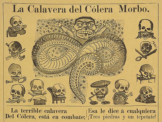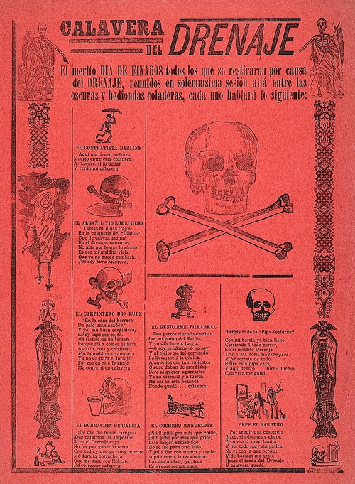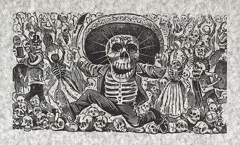 José Guadalupe Posada (1851–1913) was a Mexican illustrator known for his satirical and politically acute calaveras. Deriving from the Spanish word for ‘skulls’, these calaveras were illustrations featuring skeletons which would, after Posada’s death, become closely associated with the mexican holiday Día de los Muertos, the Day of the Dead. Most of these calaveras were published by the press of Antonio Vanegas Arroyo which produced inexpensive literature for the lower classes, including thousands of satirical broadsides which Posada illustrated. Through this focus on mortality Vanegas Arroyo and Posada satirised many poignant issues of the day, in particular the details of bourgeois life and the dictatorship of Porfirio Díaz. On January 20th 1913, 3 years after the start of the Mexican Revolution, José Guadalupe Posada died at his home in obscurity. He was penniless and buried in an unmarked grave. It was only years later in the 1920s that his work became recognised on a national and international level after it was championed by the French ex-patriot artist Jean Charlot who described Posada as “printmaker to the Mexican people”.