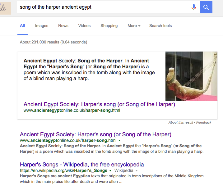 This then led me to search for the Song of the Harper. The first result was from www.ancientegyptonline.co.uk a well known general topic site on Ancient Egypt by Jenny Hill (Twitter: @AncientEgyptOnl)