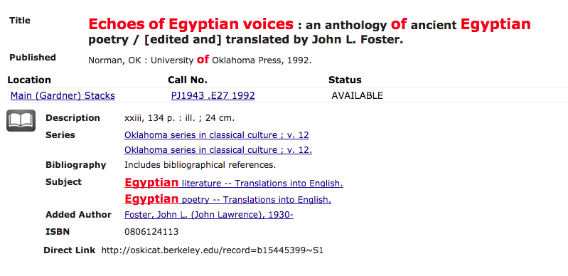 The end of the page noted that it was a "Translation by J.L. Foster in "Echoes of Egyptian Voices”. Luckily for me this book is available at Doe Library: http://oskicat.berkeley.edu/record=b15445399~S1