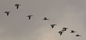 Many, if not most, birds migrate in flocks. For larger birds, flying in flocks reduces the energy cost. Geese in a V-formation may conserve 12–20% of the energy they would need to fly alone.[27][28] Red knots Calidris canutus and dunlins Calidris alpina were found in radar studies to fly 5 km/h (3.1 mph) faster in flocks than when they were flying alone.[16]
