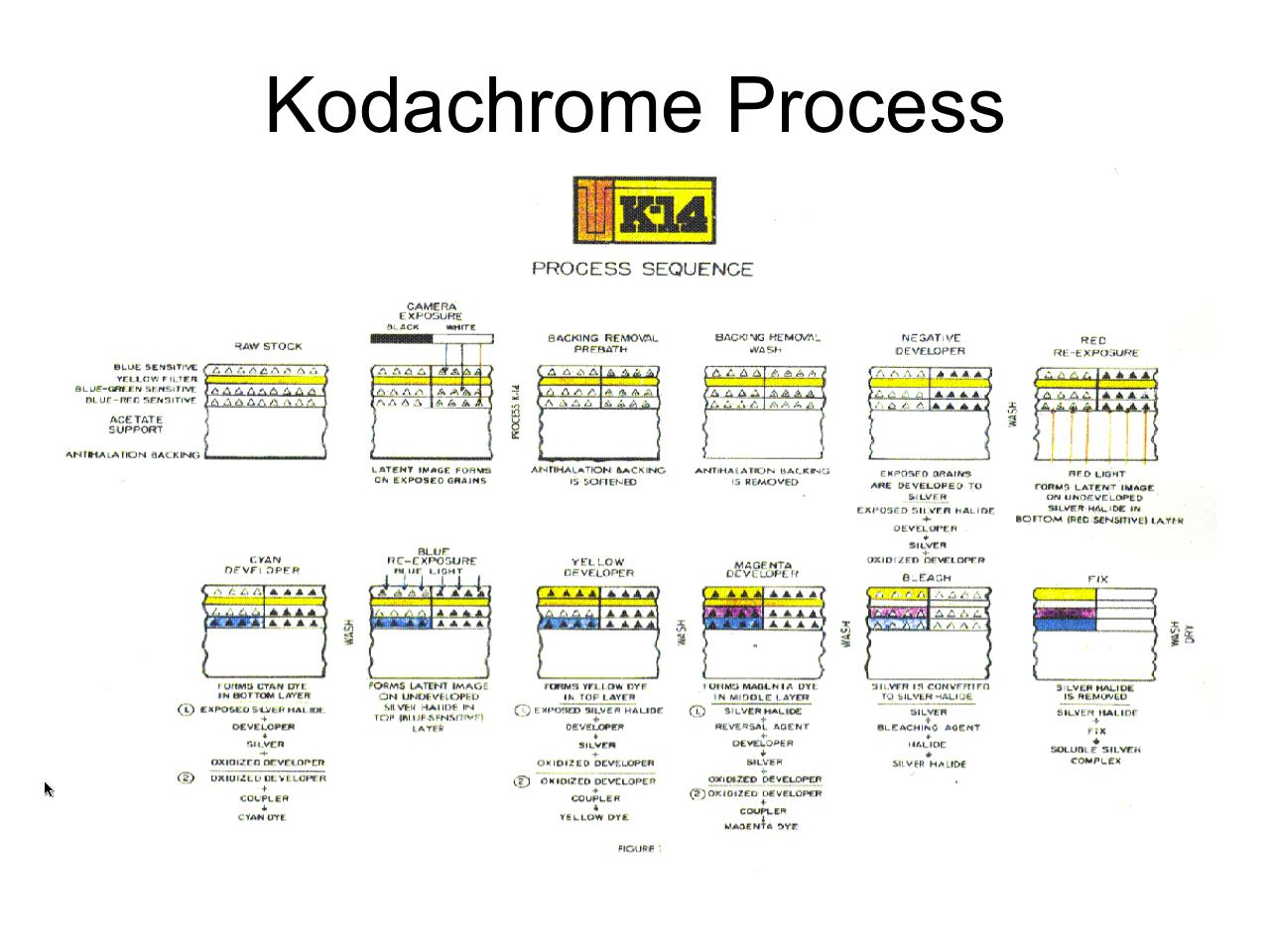 In the actual color developing process, after the black & white negative image appears, Kodachrome film is treated using two reversal exposures and one chemical reversal, each followed by a dye bath. The film is then bleached and fixedto remove unexposed silver and silver images. Dyes are induced during the process. This type of film type is called in the trade, non-incorporated. Whereas Ektachrome E-6 and Kodacolor C-41 have a simpler process because these films have dyes incorporated in then during manufacture.