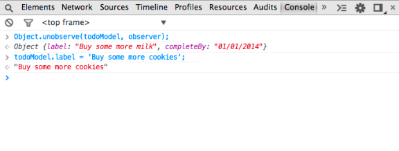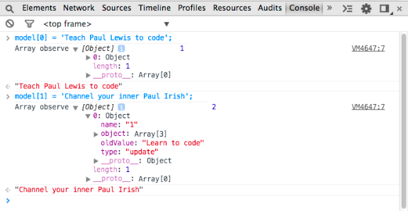 model 'Buy some milk''Learn to code''Wear some plaid' count ArrayobservemodelfunctionchangeRecords count console'Array observe' changeRecords count model'Teach Paul Lewis to code' model'Channel your inner Paul Irish'