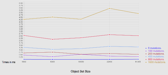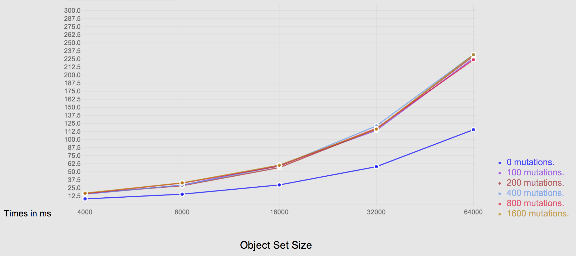 The below benchmark tests (available on GitHub) allow us to compare dirty-checking vs O.o(). They're structured as graphs of Observed-Object-Set-Size vs Number-Of-Mutations.