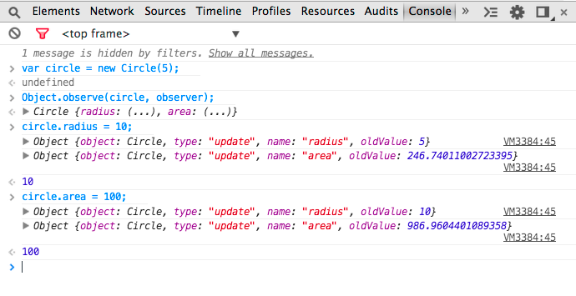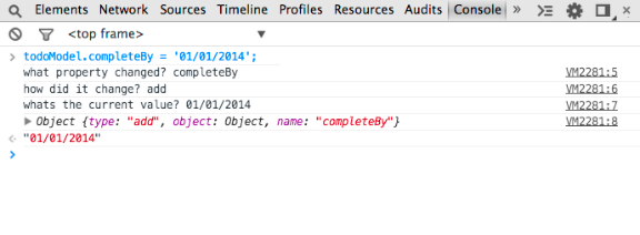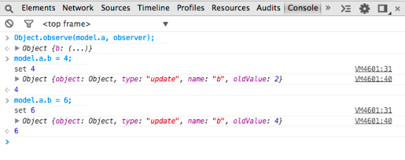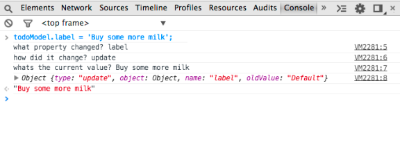 // Define a simple model model // And a separate variable we'll be using for our model's // getter in just a moment// Define a new property 'b' under 'a' with a custom// getter and setterObjectdefinePropertymodelfunctionreturnfunction// Whenever 'b' is set on the model// notify the world about a specific type// of change being made. This gives you a huge// amount of control over notificationsObjectgetNotifiernotify'update'