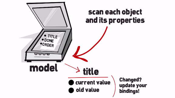The basic idea with dirty-checking is that anytime data could have changed, the library has to go and check if it did change via a digest or change cycle. In Angular’s case, a digest cycle identifies all expressions registered to be watched to see if there’s a change. It knows about a model’s previous values and if they have changed, a change event is fired. For a developer, the main benefit here is that you get to use raw JavaScript object data which is pleasant to use and composes fairly well. The downside is that it has bad algorithmic behavior and is potentially very expensive.