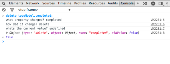 consolechange// Which we then observe, specifying an array of change // types we’re interested inObjectobservetodoModel observer'delete'// without this third option, the change types provided // default to intrinsic types