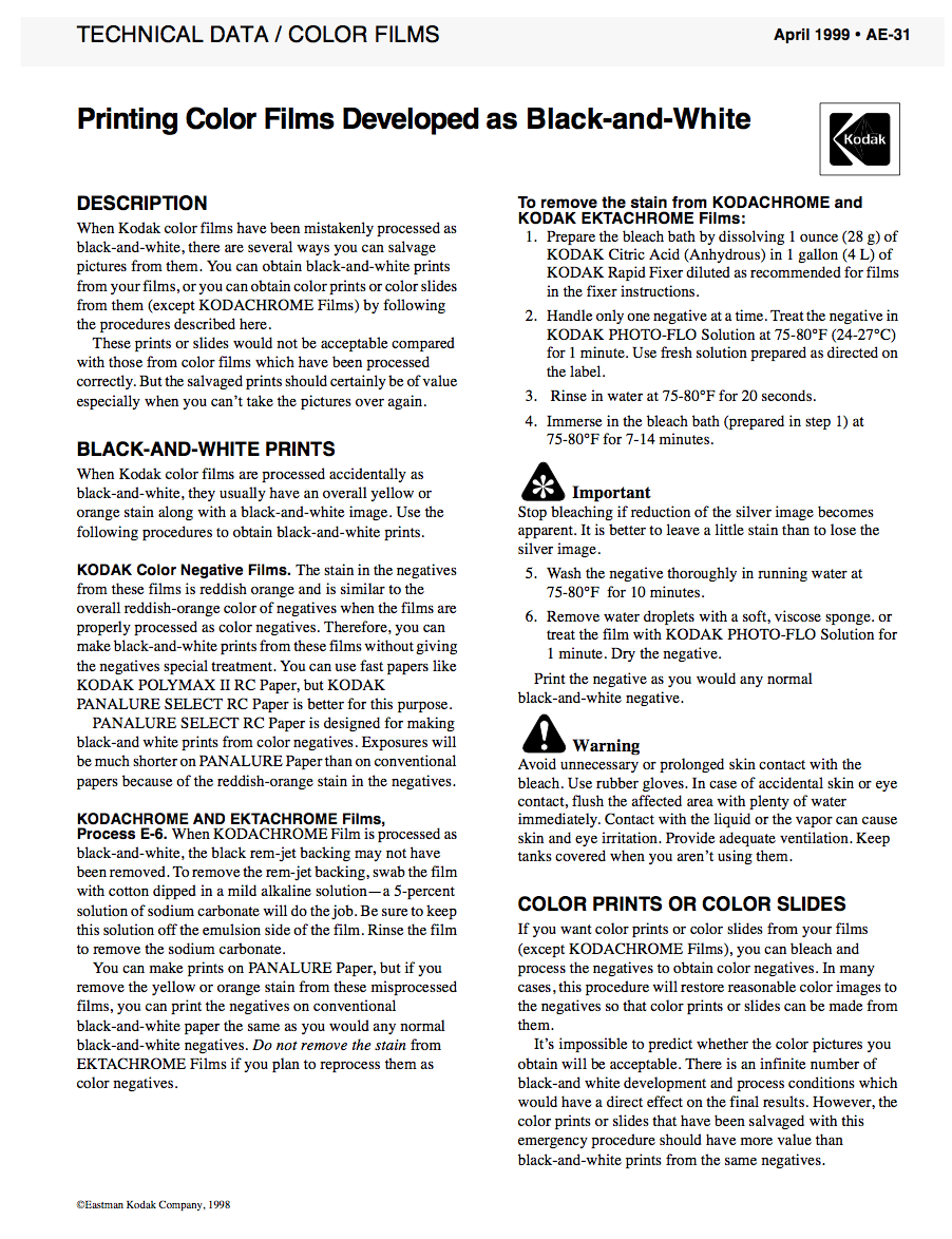 - The suggested bleach concentration provided in Kodak Technical Data for Color Films AE-31is inadequate for successful bleaching of Kodachrome films.