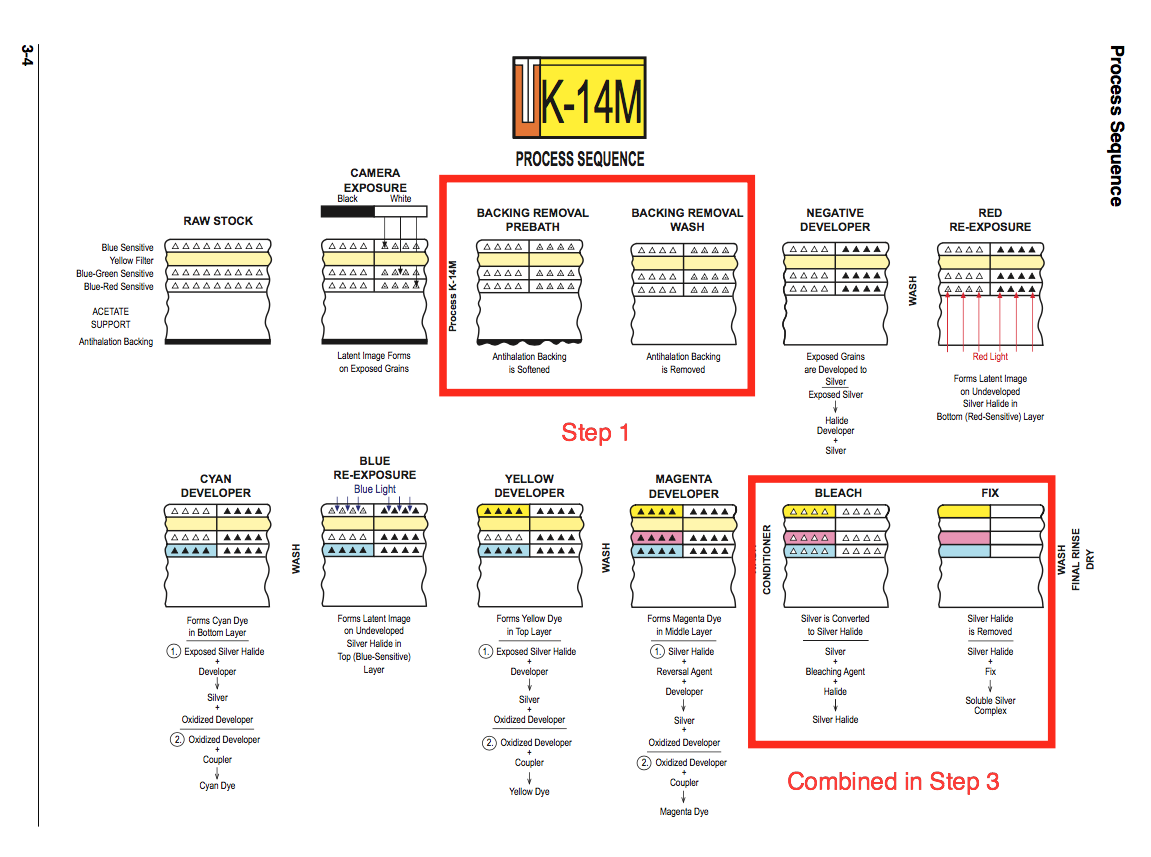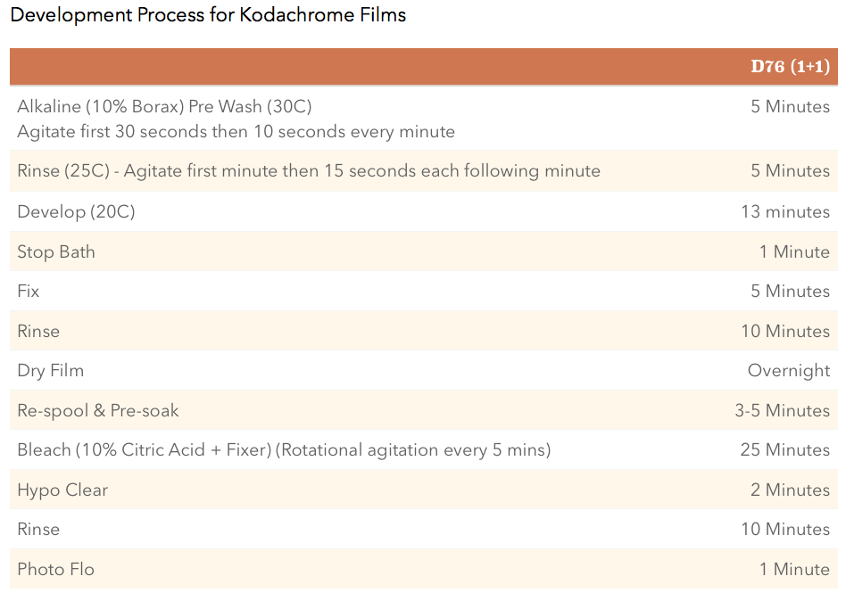 The basis for this process is rooted in Kodak Technical Data for Color Films AE-31 and Kodak Processing Steps for Kodachrome Films Z50-03.