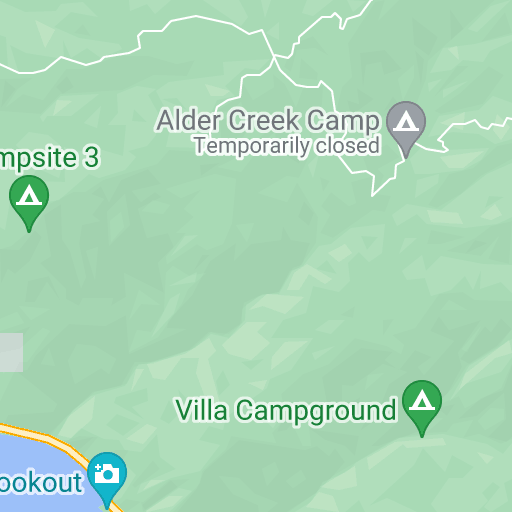 Access Alder Creek Camp via Los Burros Road (also called Willow Creek Road). This unpaved road is quite rough and rutted – not to mention steep and windy with several sheer drop-offs.