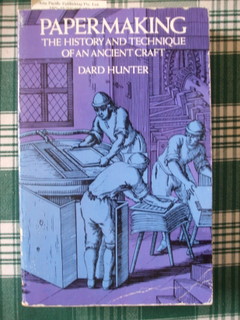The Art and Craft of Handmade Paper – Vance Studley – Studio Vista (UK) 1977 ISBN 0 289 70846 X – The first 30 pages of this book cover the history of papermaking but it soon moves on to the equipment required and how to do it, with lots of detail on preparing the fibre. The papermaking process is covered by black and white photos and then there are some projects in the back of a somewhat arty nature.