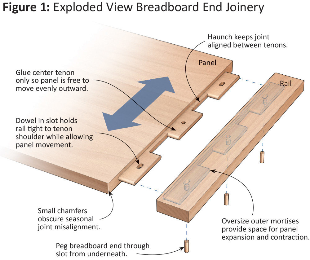 As shown in Figure 1, a breadboard end joint consists of multiple mortise-and-tenon joints separated by a haunched section. The tenons reach deeply into the cantilevered rails to give them strength. The space between the tenons allows structural integrity for the rail, which would otherwise be weakened by a deep mating mortise running the entire length. The haunched section keeps the parts aligned between the tenons.
