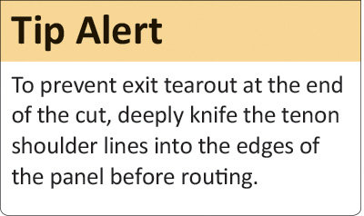Now mark the tenon shoulders fully across one face of the panel using a sharp pencil, and install a wide straight bit in your router. Adjust its depth of cut so that routing in from both faces yields a tenon that’s a hair too fat for its mortise. (Make the cuts on a piece of scrap the same thickness as your panel, and test the fit in a mortise.)