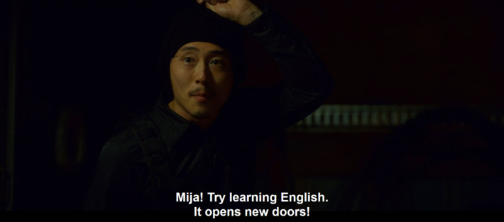 Bong wrote the character of K specifically with Yeun in mind, because he’s a character that only a Korean-American could play. Yeun’s performance itself is a nod to that gap; it reads differently if you know Korean. While it’s obvious that he’s a bit of a dolt, if you have the ear for the language, his failures are more apparent, because he speaks with the stiltedness of a second-generation speaker (Yeun’s actual pronunciation is a lot better). He’s not quite sure of himself, and is trying to fit into both spaces, but can’t. (This is also why the other subtitle joke that I saw, “How’s my Korean?” works in a subtler way.) Yeun said the character “speaks to the island we live on”: He was a character written for Korean-Americans.