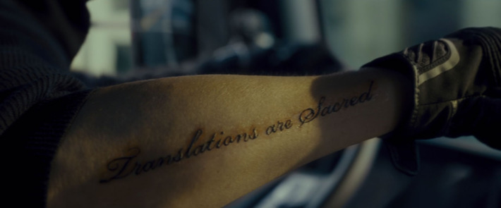 Throughout Okja, Bong plays with the idea of translation, both its necessities and inherent limitations, and the inevitable comedy that arises out of that space. When Jay learns that K deliberately lied, he starts to beat him up, telling him to “never mistranslate!” Toward the end of the movie, K pops back up with a fresh tattoo that reads, “Translations are sacred.”